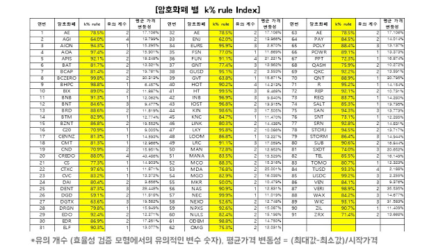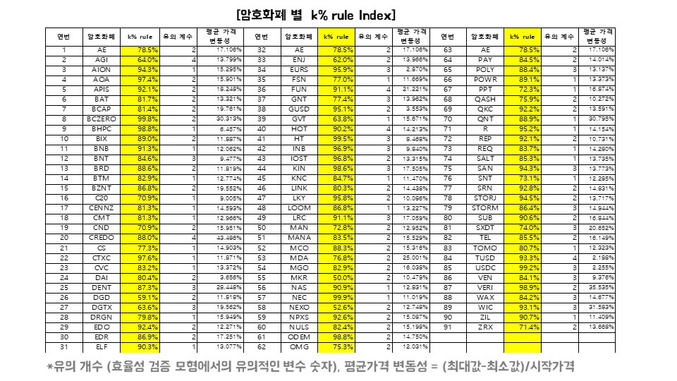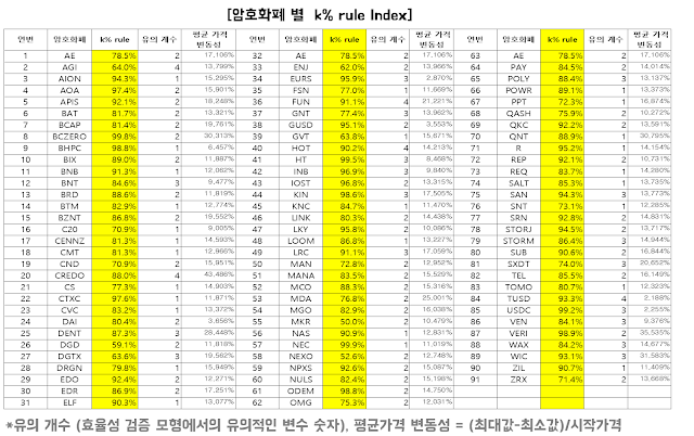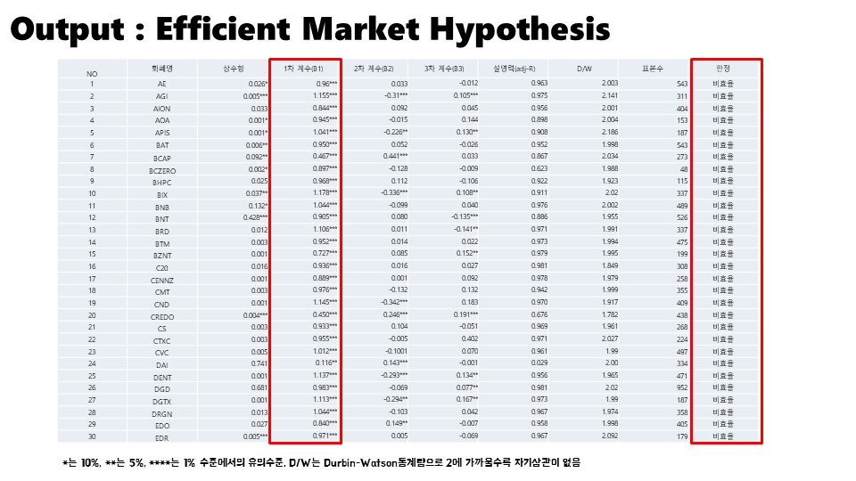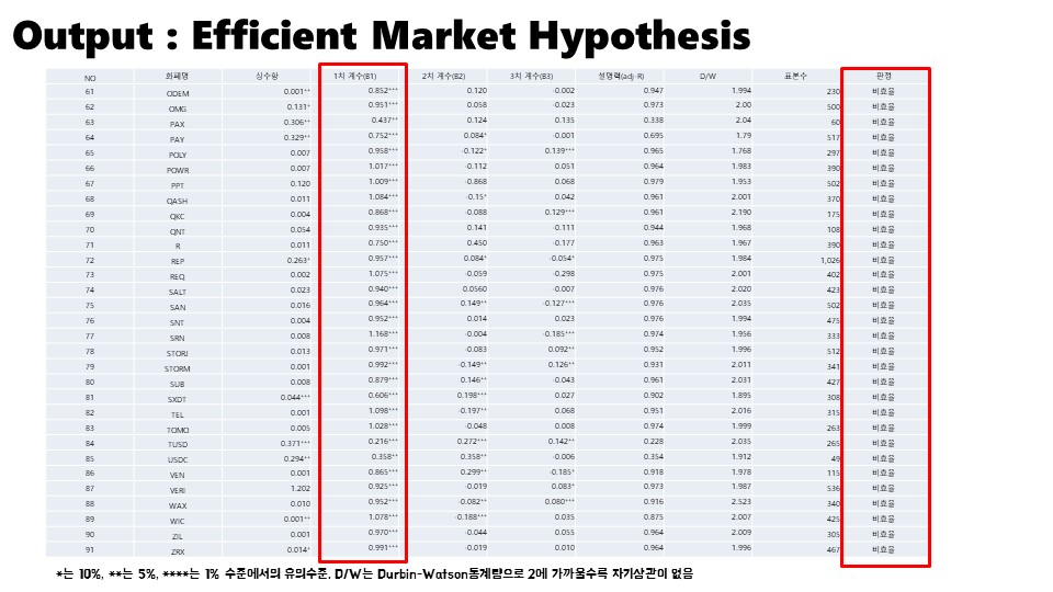 우선 분석 대상의 암호화폐 전부가 정보 비효율성이 있는 것으로 나타나서, 다음과 같이 가설을 수정했습니다.