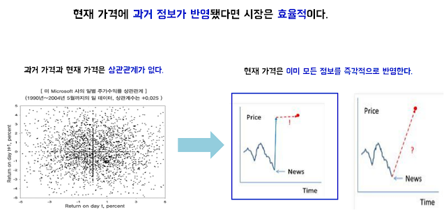 (효율적 시장가설에 대해서는 다음에 쉽게 정리하도록 하겠습니다. ‘가설’이라는 이름에서 알 수 있듯이 이를 지지하는 연구와 부정하는 연구가 꽤 많습니다)
