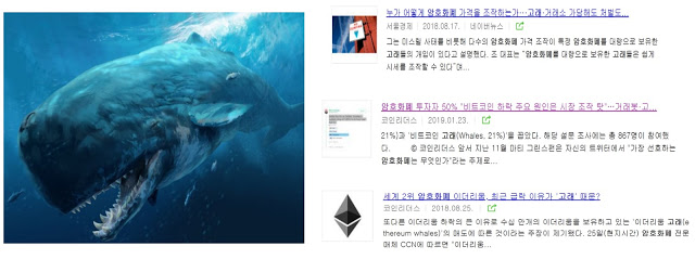 “고래(Whale)”이라는 말이 눈에 들어왔습니다. 고래라는 것은 암호화폐 시장에 참여하는 큰 손들 혹은 기관을 일컫는 말인데요. 뉴스를 보니 고래는 암호화폐 시장에서 그리 좋은 평가를 받고 있지 않았습니다. (보통 밍크 고래같이 대박인 경우가 있는데 말이죠…)