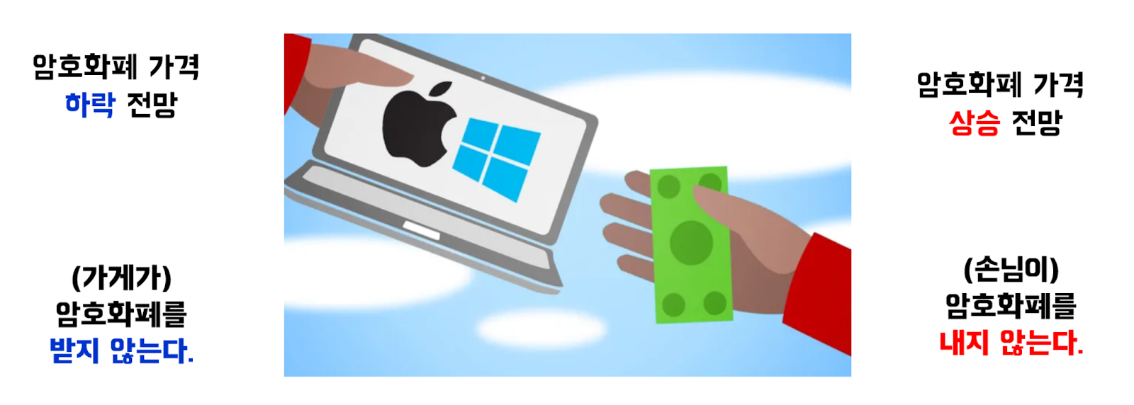 반대로 암호화폐 가격이 하락이 예상되면 손님은 가격이 떨어지기 전에 암호화폐로 결제를 하려고 합니다. 하지만 가게 주인은 암호화폐로 물건 값을 받으면손해를 보기 때문에