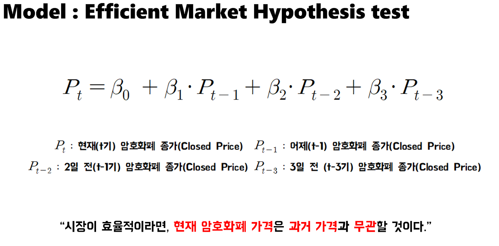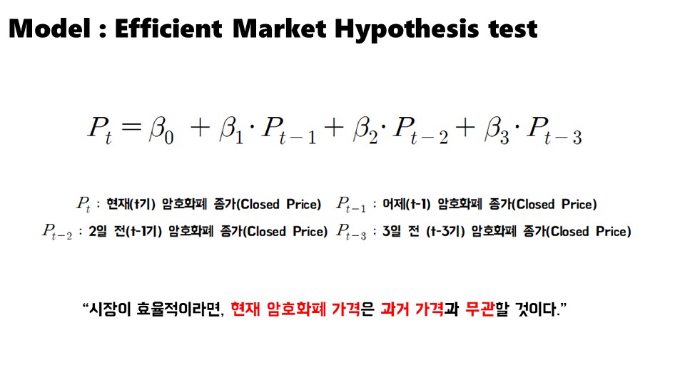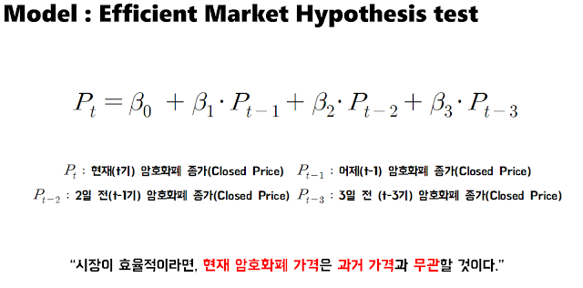 암호화폐에 대해서 효율적 시장가설을 검증하기 위해 다음과 같은 모형을 사용했습니다. 만약 시장이 효율적이라면 현재의 가격은 과거의 가격과 상관이 없을 겁니다.