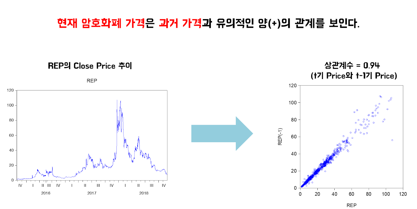 암호화폐 중 하나인 REP에 대해서 분석해 봤습니다. 안타깝게도. 현재의 가격은 과거의 가격과 유의적인 양(+)의 관계를 보였습니다.