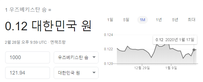 우즈베키스탄에서 사용하는 화폐는 숨(сўм)입니다. 환전을 할 때는 우스베키스탄 숨(UZS)라고 써진 곳을 보면 됩니다. 하지만 우리나라 대부분의 은행에서 ‘숨’은 환전이 안됩니다. 그래서 보통은 달러로 환전한 다음 우즈베키스탄 현지에서 숨으로 환전합니다.