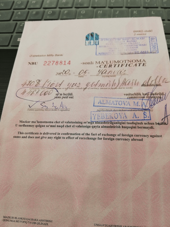 우즈베키스탄에서 처음 오신 분들은 대부분 환전할 때 놀랍니다. 1숨이 우리나라 돈으로 0.12원입니다. 그리고 우즈베키스탄 지폐 중에 가장 고액권은 50,000숨입니다. 50,000숨이면 우리돈으로 대략 6,000원 정도 됩니다. 그래서 환전하면 “돈다발”을 만져볼 수 있습니다!!!! (신난다)