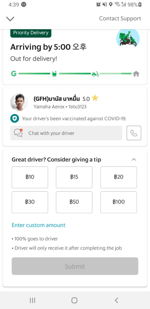 우리나라 배달 서비스와 차이점이 음식을 주문하면 즉시 라이더가 정해진다는 것입니다. 여기서는 간단하게 라이더에게 메모를 남길 수 있습니다. 또 TIP을 줄 수 있습니다. TIP의 경우 상한선이 100바트로 우리 돈으로 3300원이 조금 넘는 수준입니다.