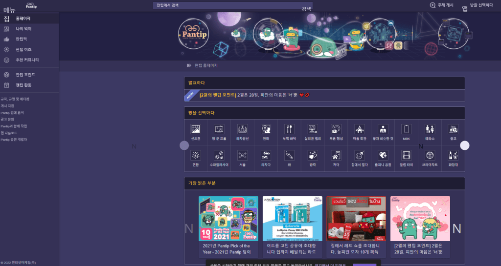 Pantip의 특징은 다양한 주제에 대한 토론 “테이블”입니다. 테이블 이름은 Siam Square , MBK Center , Silom 및 Chatuchak Weekend Market 과 같은 태국의 유명한 장소의 이름을 따온 것이 많습니다. 자세히 보니 익숙한 지명이 있군여 “Seoul”이라고 있는데 여기는 우리나라 콘텐츠나 여행 등을 다룬 방입니다.