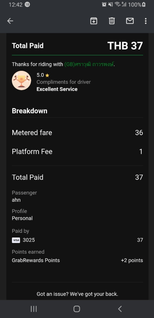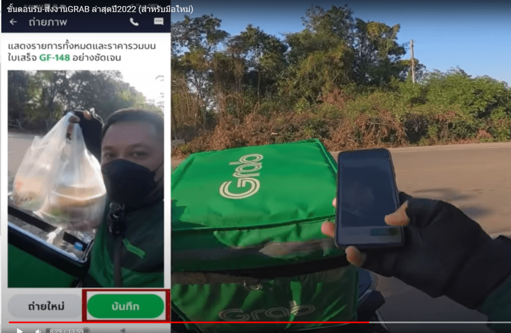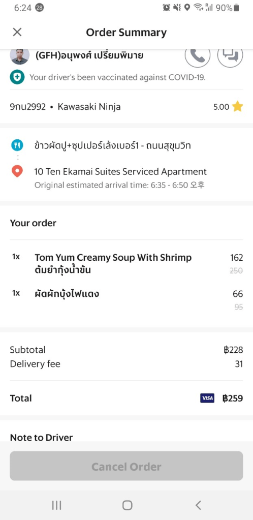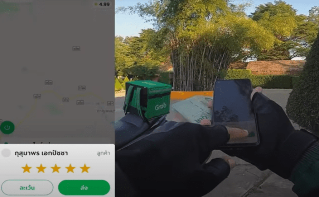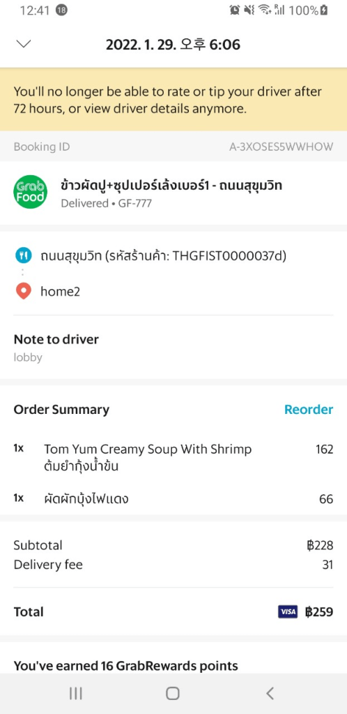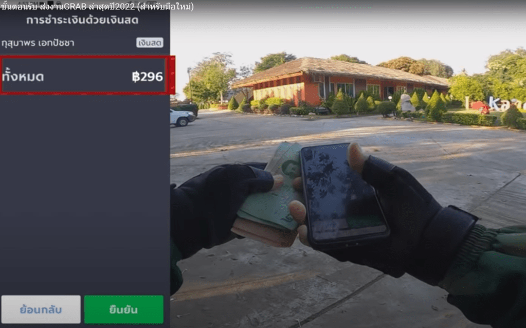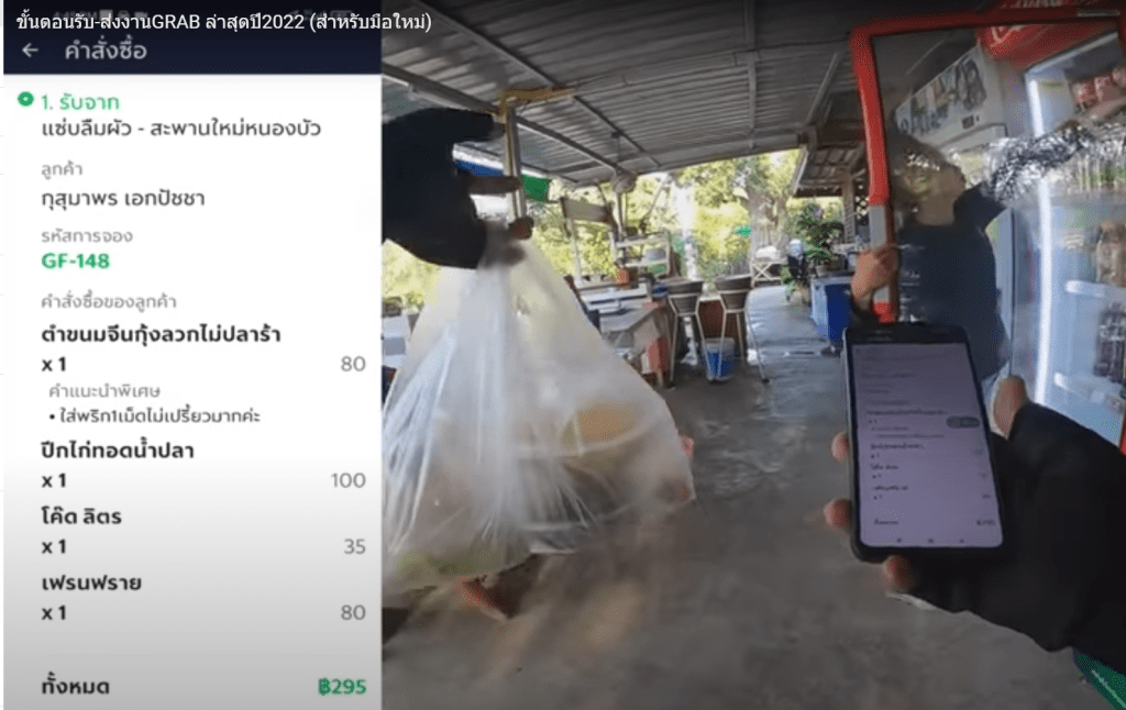 295바트가 나왔는데, 라이더 님이 음식을 받으면서 따로 현금을 내지는 않았습니다. 따로 영수증을 받는 모습은 나오지 않았습니다. 따로 종이로 된 영수증이 없는 것으로 보아 아마도 Grab라이더가 Grab Pay로 결제하고, 나중에 고객으로 부터 돈을 받는 구조로 보입니다.