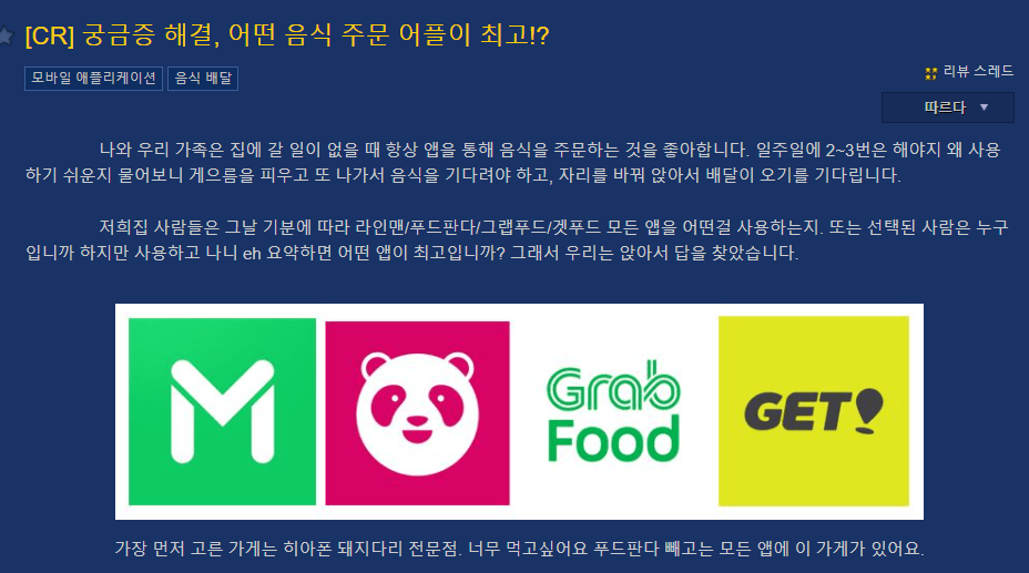 다만 Grab의 경우에는 프로모션을 준다고 해도, 사용하기가 불편하고, 쓰지 못하는 경우가 많다는 의견이 있었습니다. Foodpanda는 프로모션이 괜찮지만 음식점이 많이 없다는 의견이 있었습니다.