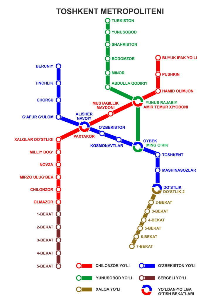 아래는 노선도입니다. 제가 주로 이용한 노선은 빨간색(CHILONZOR 노선)입니다. 우리말로는 보석이라는 뜻인데, 역 중에는 OLMAZOR(다이아몬드) 와 같은 이름도 있습니다. 그리고 우리말로 1번역(1-BEKAT), 2번역(2-BEKAT)과 같은 이름을 가진 역들도 있습니다.