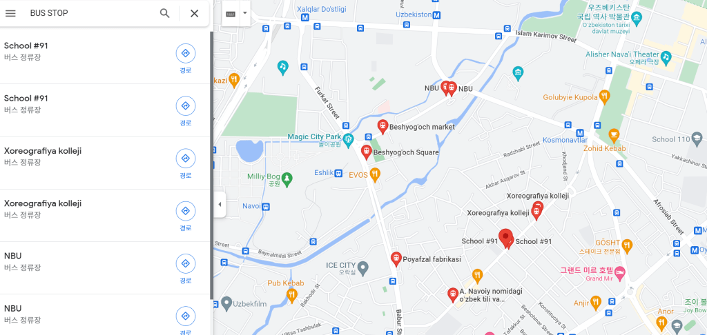 전 세계적으로 구글맵을 이용하면 쉽게 사용할 수 있지만, 대중 교통 만을 위한 앱을 쓴다면 2GIS를 추천드립니다. 단, 이 서비스는 우즈베키스탄 뿐 만 아니라 다른 나라에서도 사용할 수 있는 앱입니다. 특히 영어지원이 되기 때문에 외국인이 쓰기 좋은 서비스입니다. 현지인들도 이 앱을 잘 쓴다고 합니다.