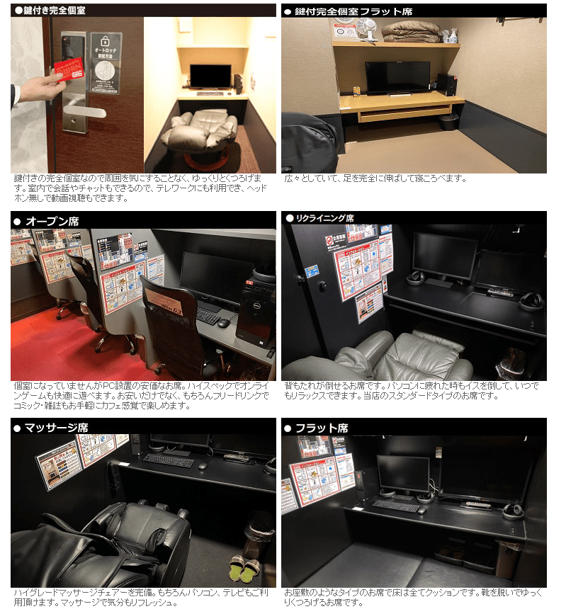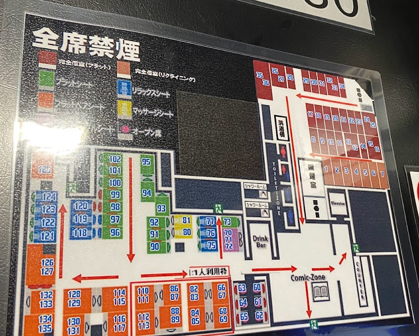 좌석은 총 135개 좌석입니다. 좌석의 종류는 크게 3종류입니다. 우리나라 pc방처럼 오픈된 좌석, 그리고 1인 파티션으로 된 좌석, 그리고 개별 방으로 된 좌석입니다. 그리고 1인 파티션으로 된 좌석의 경우에는 뒤로 누울 수 있게 된 마사지 의자입니다. 그리고 개별 방은 앉아서 작업할 수 있도록 됐습니다.
